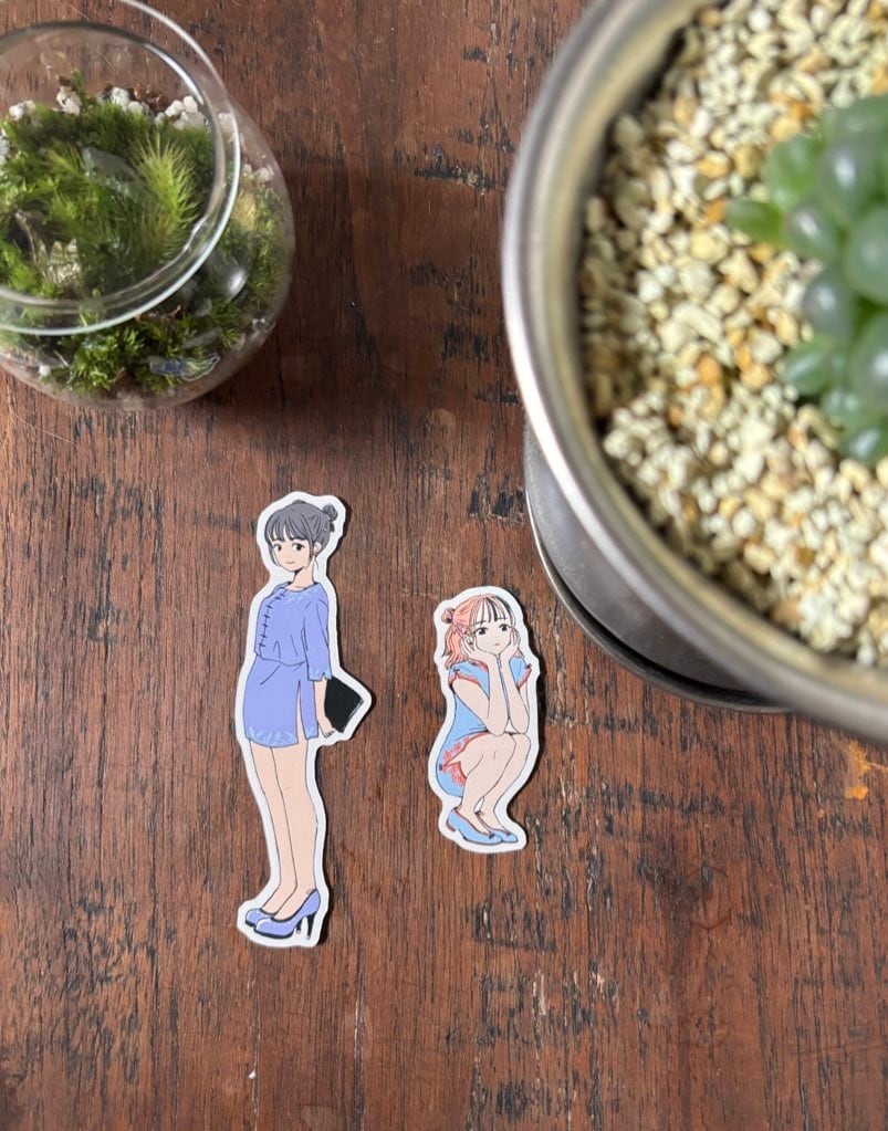 かわいい。小さめステッカーです。2人セットで販売しています。少しパール紙みたいになっているのも良いです